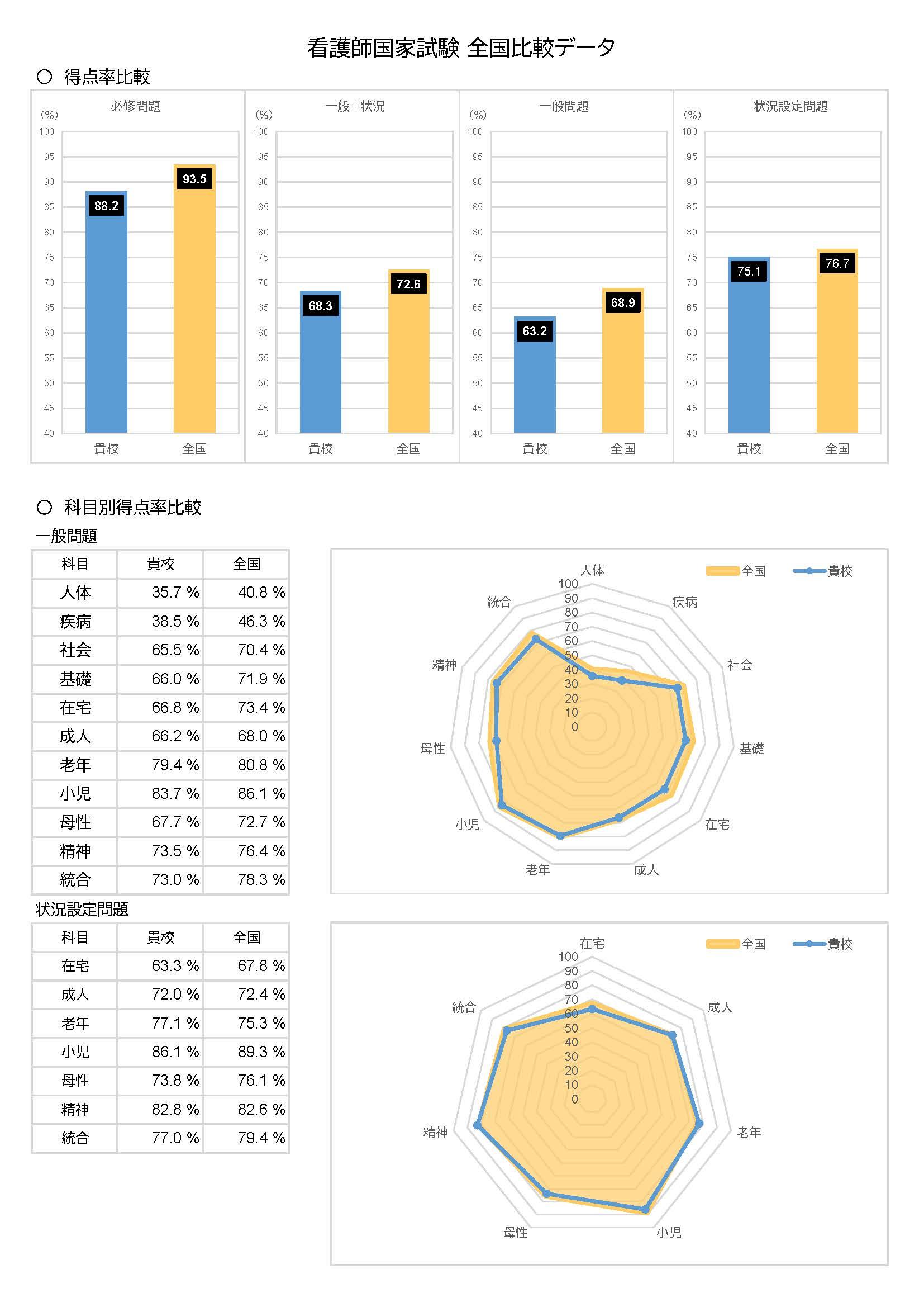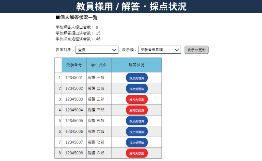 WEB成績閲覧サービスで結果公開スタート 学生様、教員様ともに弊社HPより結果をご覧いだけます。 【学生様】国試総合成績 【教員様】個人一覧、全240問の解答分析 ※紙面での結果発送はございませんので予めご了承ください。 |
